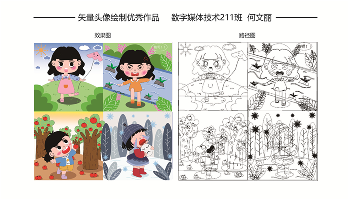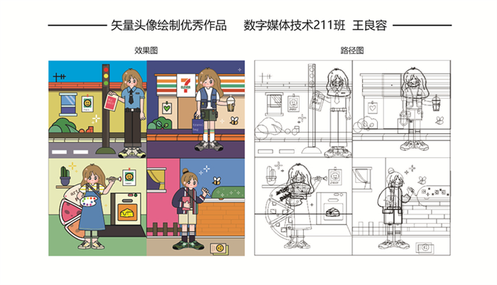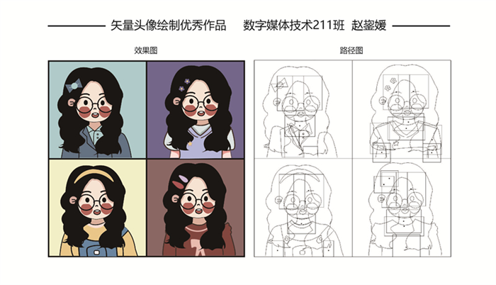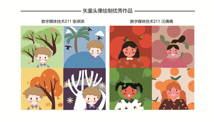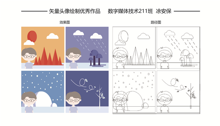 矢量头像绘制——要求抓住自身特征,再结合自己喜欢的主题,使用Ai软件制作矢量头像四宫格,色彩搭配合理,路径清晰准确。