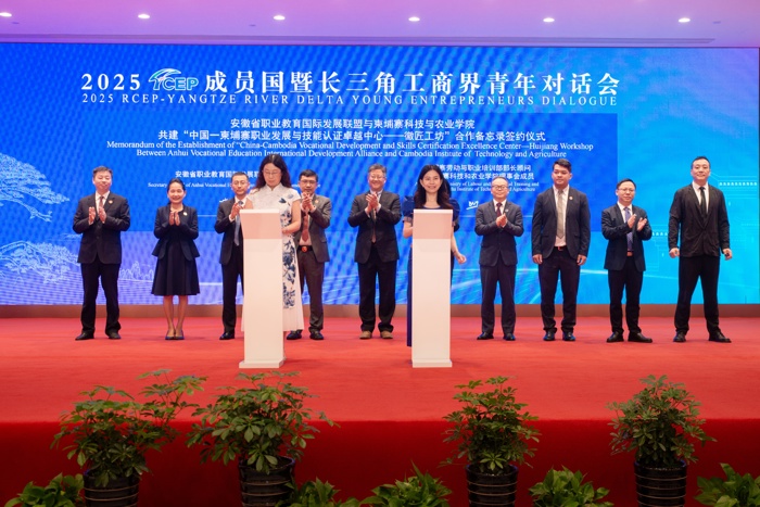 日期:2025-06-10 来源:6月5日至6日,2025 RCEP地方政府暨友城合作(黄山)论坛及柬埔寨劳动与职业培训部-安徽省教育发展基金会座谈会在黄山举行,学校党委副书记、院长王炜受邀参会。在分论坛“2025 RCEP成员国暨长三角工商界青年对话会”上,王炜参加了“中国-柬埔寨职业发展与技能认证卓越中心——徽匠工坊”备忘录签署仪式。此项目由安徽省教育发展基金会牵头组织,我校等7所省内职业院校与柬埔寨科技与农业学院共同建设。建设内容包括开展标准研制及资源建设、开展职业培训、开展学历教育合作、组织中柬职业技能竞赛、建设国际产教融合中心、打造中柬国际化师资队伍和推动中柬文化交流等。电子商务学院院长王从辉、学校办公室外事科科长叶兴参会。