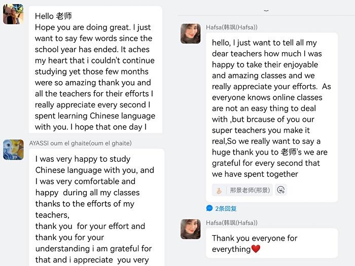 在中泰合作“丝路电商”班、大数据班两个学历留学生班级的期末学业进步报告会中,相关任课教师依次发言,回顾本学期学生的学习表现,分析期末考试结果,布置暑假作业并勉励同学们合理规划暑假时间,坚持语言学习不松懈。同时,留学生们也向老师们汇报了线上学习情况、困难和问题以及当下在本国生活的情况。