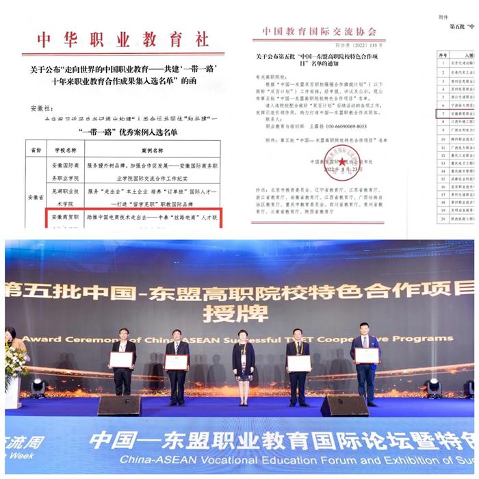 特色项目打造职教品牌。学校“中泰‘丝路电商’人才培养项目”入选“中国-东盟高职院校特色合作项目”,学校成为“中国-东盟职业教育联合会”正式成员单位,成为安徽省唯一入选高职院校。时任党委副书记、院长李忠应邀主持2022年中国-东盟职业教育国际论坛暨特色项目合作成果展第四场专题研讨并代表学校展示我校特色合作项目。学校案例“助推中国电商技术走出去——中泰‘丝路电商’人才联合培养项目”成功入选中华职教社“共建‘一带一路’十年来职业教育合作成果集”,并在2023“一带一路”职业教育国际论坛上予以发布。