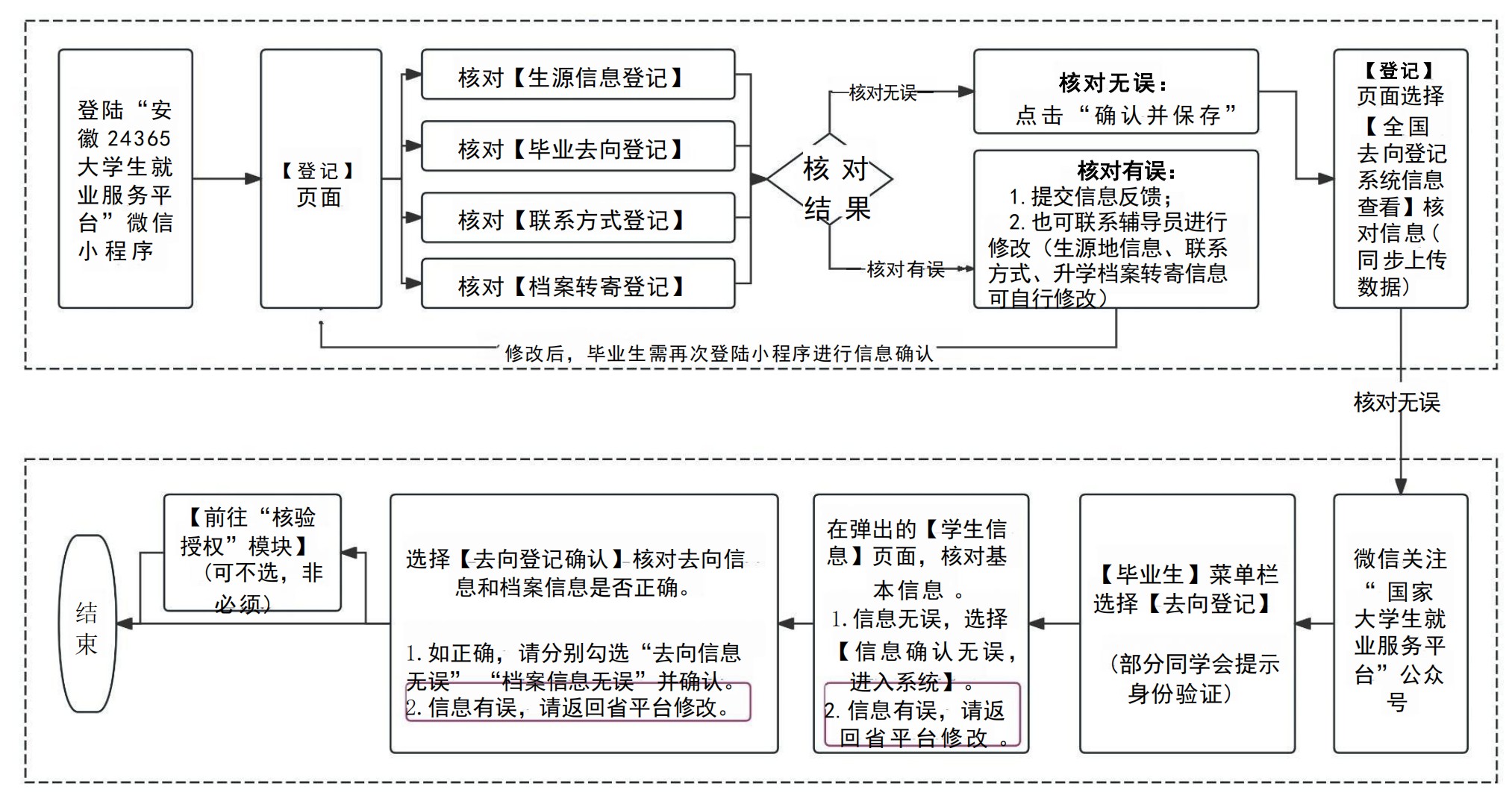(二)请各二级学院指导毕业生6月29日前通过安徽24365大学生就业服务平台和全国登记系统(https://dj.ncss.cn)对毕业去向信息和档案信息进行核对、确认。档案寄发前,若毕业生档案转递信息发生变化,可联系辅导员更新信息;档案寄发后,若毕业生档案转递信息发生变化,需与毕业档案接收地联系办理档案转寄手续。