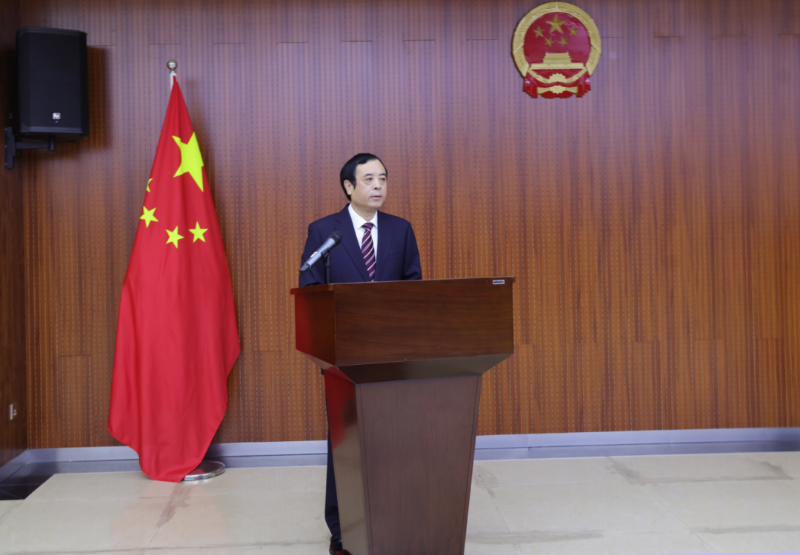 仪式现场气氛庄严,国徽高悬,国旗鲜艳。上午9时,参加人员全体肃立,奏唱中华人民共和国国歌。领誓人厅一级巡视员贾宝明左手抚按宪法、右手举拳、领诵誓词,其他宣誓人列队站立、跟诵誓词。