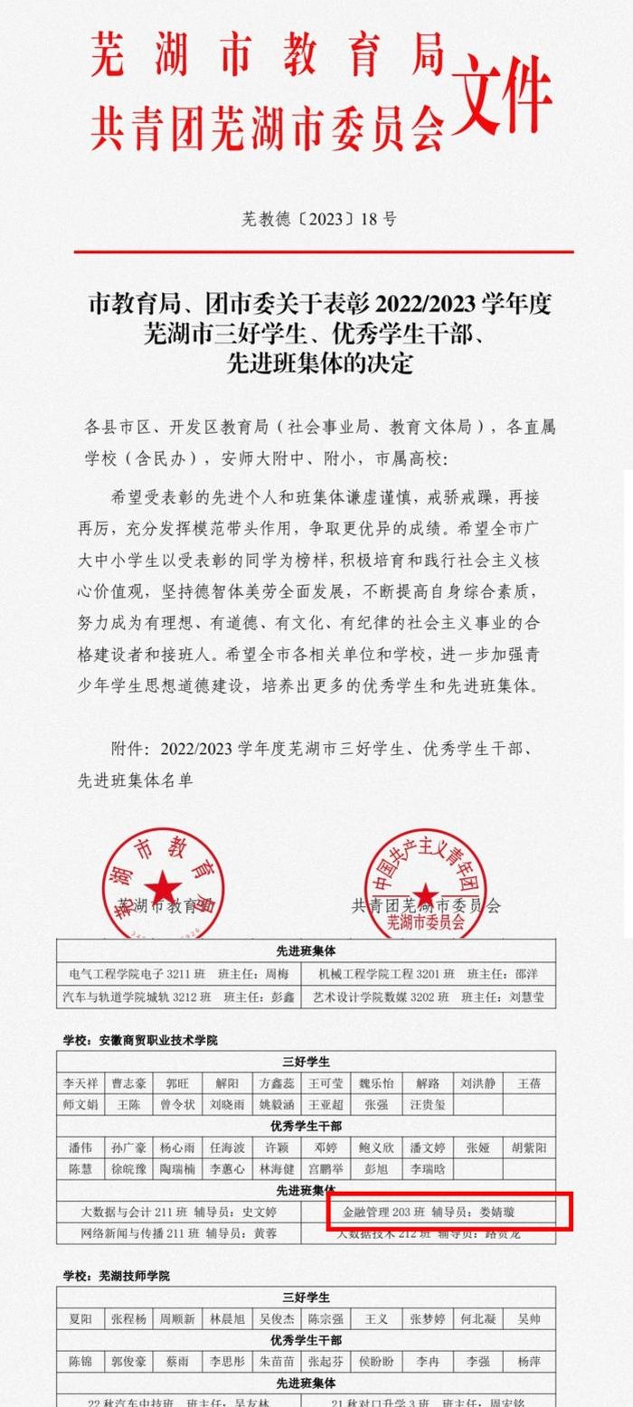 4月24日,共青团芜湖市委员会、芜湖市教育局发布关于表彰2022/2023学年度芜湖市三好学生、优秀学生干部、先进班集体的决定,金融科技学院金融管理203班荣获2022年度“芜湖市先进班集体”称号。