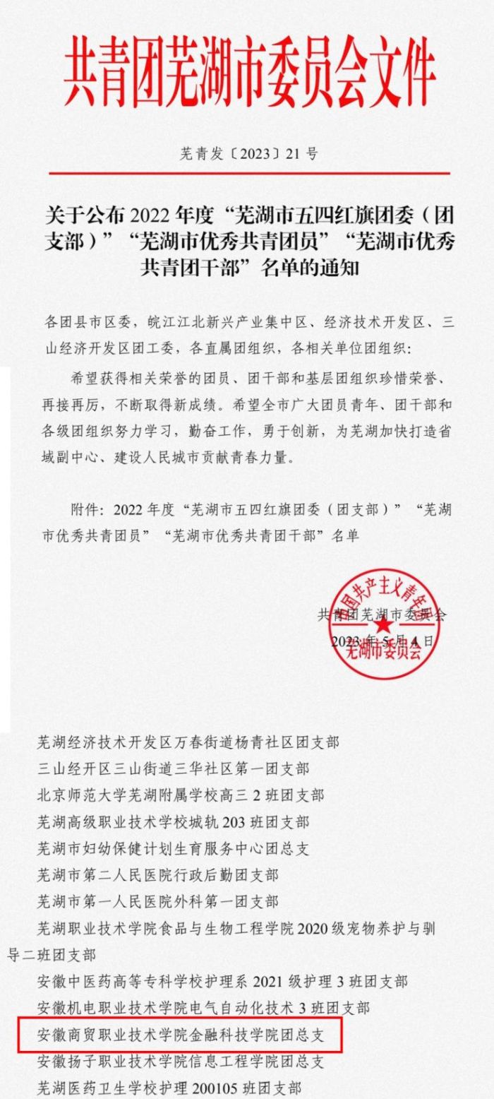 5月4日,正值青年节当天,共青团芜湖市委员会公布2022年度“芜湖市五四红旗团委(团支部)”“芜湖市优秀共青团员”“芜湖市优秀共青团干部”名单的通知中,金融科技学院团总支荣获2022年度“芜湖市五四红旗团总支”称号。