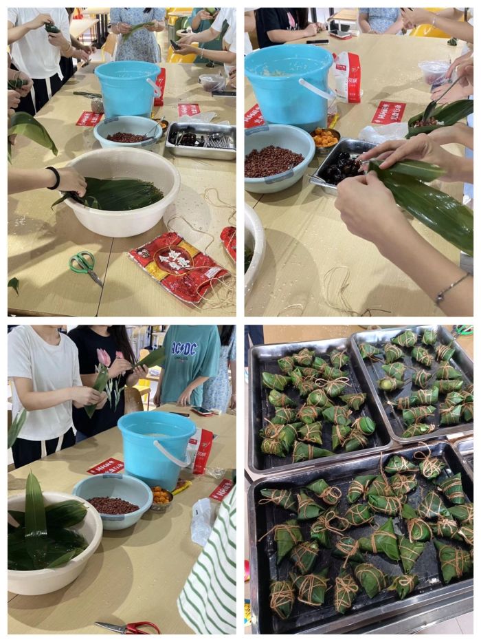 随着时间的流逝,我们的粽叶糯米也所剩无几,多出来的是一排排包好的粽子,最后在大家的欢声笑语中,我们结束了今天这带着满满祝福的活动。