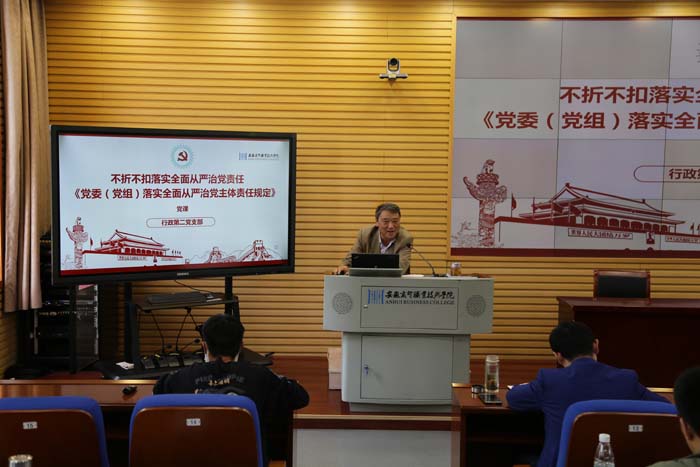 俞木传作了题为《不折不扣落实全面从严治党责任》的专题党课报告。他围绕《党委(党组)落实全面从严治党主体责任规定》(下称《规定》),从制定的背景、意义以及《规定》的具体条文内容三个方面进行解读。俞木传指出,在党内现存问题未得到根本解决的情况下,全面从严治党必须坚定不移、长期坚持、巩固发展。他从全面从严治党主体责任的内容、方式以及监督追责等方面对《规定》的25条内容进行逐条解析,并强调作为高校工作者要加强理想信念教育,补足精神之钙,防止各类错误思想文化侵蚀,不断增强自我净化、自我完善、自我革新、自我提高能力。