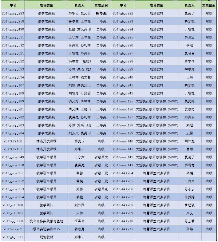 本次质量工程项目申报由学校质量工程办公室统一组织,各系、部根据专业建设和教学改革实际情况精心筹备,申报各类项目共计183项,经学校教学工作委员组织校内外专家评审推荐至省厅72项,最终共有教学成果奖16项(其中特等奖1项)、安徽省“十三五”规划教材建设项目12项和MOOC、智慧课堂试点、教学团队、精品开放课程等29项成功获得教育厅立项建设或奖励。