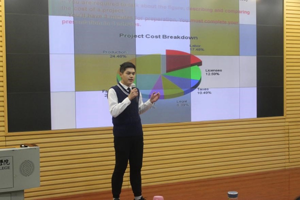 本次比赛由人文外语系五位英语教师担任评委,外教William担任提问嘉宾。大赛包括预赛、复赛和决赛三个阶段,历时一个多月。经过预赛和复赛阶段的激烈角逐,共有22名选手进入非专业组决赛,17名选手进入专业组决赛。决赛分为图表描述、现场问答和辩论PK三个环节。选手们在赛场上用流利的英语展示自我魅力,对外教的提问灵活应答,其中不乏风趣幽默的互动,精彩纷呈的表现赢得了观众们的阵阵掌声。