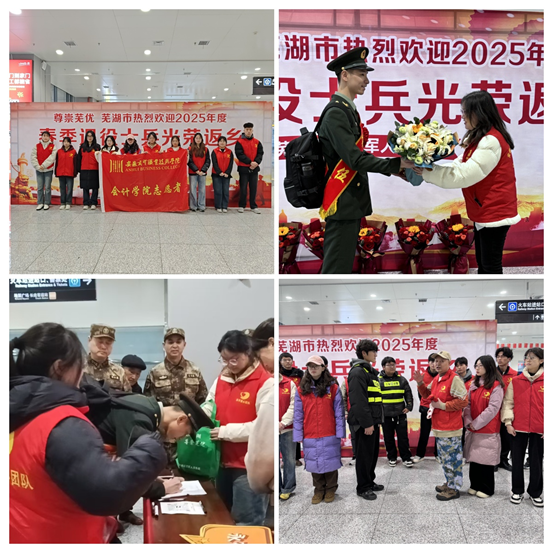 3月3日清晨,身着红色马甲的会计学院志愿者们早早来到芜湖火车站,开展欢迎退伍士兵光荣返乡接站服务。志愿者们穿梭于出站口与候车大厅之间,维持现场秩序、帮助退役士兵搬运行李、为退役士兵送上鲜花并主动提供“一对一”帮扶,为退伍军人与家人和老兵合影留念。“我曾经也是一名军人,现在再看到穿着军装的同僚,听到那声真诚的‘谢谢’,对我来说意义非凡。”大数据与会计244班的退役士兵志愿者薛磊笑着说道。活动期间,志愿者们累计服务旅客100余人次,会计学院的红色身影成为车站里最动人的风景线。