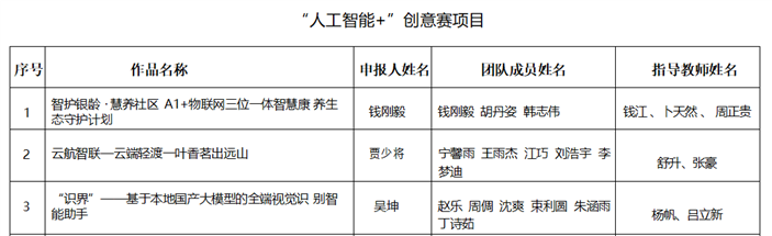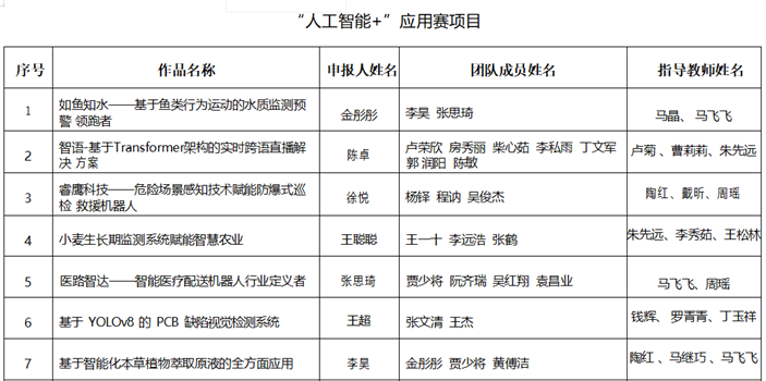 根据《关于组织推报“挑战杯”全国大学生课外学术科技作品竞赛“人工智能+”专项赛的通知》要求及挑战杯赛事规程,我校积极动员,认真组织,经过团队申报、专家评审等环节,拟推荐共计10项作品参加“挑战杯”“人工智能+”专项赛,其中“人工智能+”创意赛3项、“人工智能+”应用赛7项,具体名单公示如下: