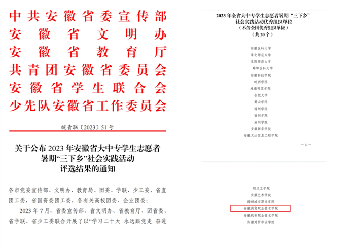 近日,2023年安徽省大中专学生志愿者暑期“三下乡”社会实践活动评选结果公布,我校暑期“三下乡”社会实践活动荣获优秀组织单位称号。