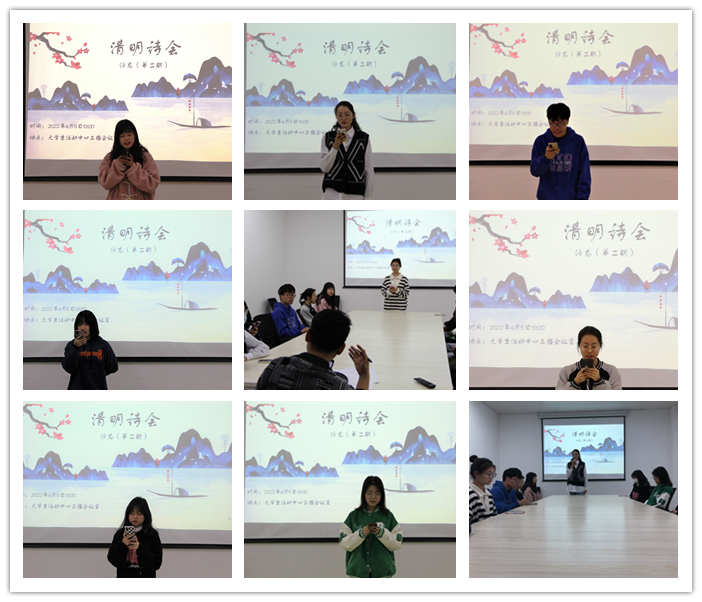 清明节当晚,学校举行“清明诗会”交流活动,以诗歌的形式迎接春的到来。20余名朗诵爱好者积极参与,他们普通话标准,朗诵节奏鲜明、情感丰富、表达自然,当读到“伫立墓前,我仿佛听到隐约的军号声在召唤,一排排烈士墓如同一队队威武的士兵整装待发”时,学生们的眼睛湿润了,声音哽咽了,强烈的共鸣感染着在座的每一位听众。“我们宁静安稳的今天,正是他们用生命点亮的明天”,同学们在感悟经典中感念先烈先贤先人,慎终追远。