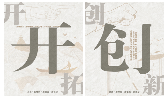 设计理念:作品以新徽商精神中“开拓创新”为主题。两幅作品的字体都采用了开拓创新有关词语,作为画中的一笔,其中“开”后面的背景为山水,上方是一个指向前方的手势,意味着我们会向着正确的方向开辟山水,去开辟道路与未来;“创”后面则是徽派建筑,房屋与道路,上方是一个握紧的拳头,意蕴着我们每一个徽州人都在用自己的努力去开辟,去创造,去建设我们自己的家园。