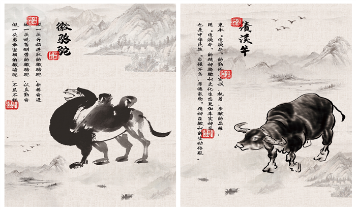 设计理念:作品以传统徽商文化中的“徽骆驼精神”和“绩溪牛精神”为思路进行创作,将厚德担当、诚信图强、超越创新的新徽商精神融入其中。采用具有浓厚中国风情的水墨画创作手法,进一步渲染出古朴、悠久的徽韵氛围。以一幅优美的徽州山水画作为海报的背景,寓意着在徽州山水的孕育下,一代代徽州人不断进取,敢于创新,一步步踏出一条饱经风霜的荣光之路。时序更替,奋斗不止,沐浴着新时代的春风,作为商贸学子,更要倍加珍惜机遇、努力学习,传承与弘扬“徽骆驼”和“绩溪牛”精神,为建设美好安徽作出更大贡献。
