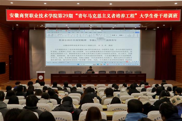 校关工委副主任郑光贵作《传承弘扬百廿安商精神 争做奋发有为强国青年》报告,带领广大学员回顾了李广炯、卢仲农创办安徽公学的历史背景和三次曲折的创校过程,号召同学们要传承弘扬百廿安商“忧国忧民、无私奉献、与时创新、力争上游、思想进步、敢于革命、百折不挠”的精神,做奋发有为的强国青年。马克思主义学院院长杨卫宏以《以科学理论武装头脑 以奋斗姿态激扬青春》为题,带领同学们学习了习近平新时代中国特色社会主义思想的创立背景、科学内涵和历史地位,勉励同学们要做有理想、敢担当、能吃苦、肯奋斗的新时代好青年。为进一步提高学生文明礼仪修养,点点taptapCS处处长兼团委书记孙握瑜受邀作《浅谈大学生文明礼仪建设工作》报告,他从情商的一个小切入点着手,向学生阐述了文明礼仪是情商的重要体现,并细化介绍了大学生文明礼仪建设年的实施方案和阶段性成果。