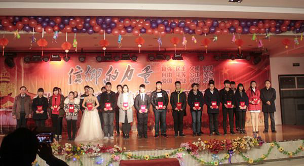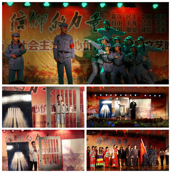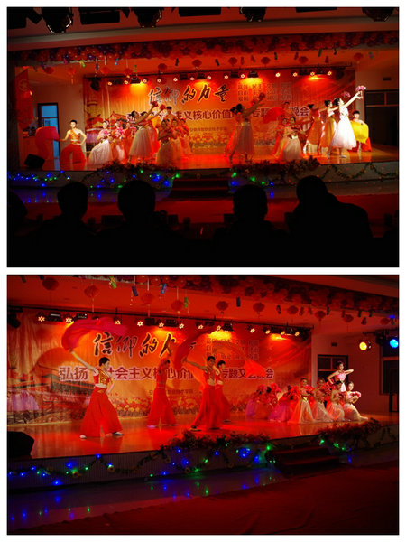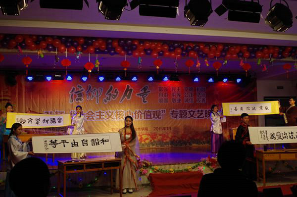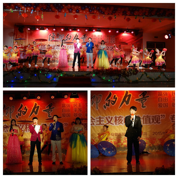 自开展社会主义核心价值观活动以来,在院党委的组织领导下,团委、各团总支、各学生组织共同协作,开展一系列丰富多彩的实践活动,积极践行社会主义核心价值观,加强宣传教育。晚会前在《社会主义核心价值观之歌》雄壮的歌声中,通过专题幻灯片回顾了团委、各团总支、各学生组织开展的活动图片。歌声、图片的烘托使得整个会场充满了正能量。
