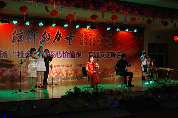 整台晚会历时一个半小时,不同风格、不同主题的节目紧紧围绕社会主义核心价值观,并与之呼应,彰显思想精髓。舞蹈《和谐中国》展现了新中国65年的辛勤耕耘;情景朗诵《民主之路》展示了中华民族前赴后继,奋勇拼搏的历程;《华夏瑰宝》的中华武术、书法、汉服向现场观众展示了中华民族五千年的历史文明;舞蹈《茉莉花》表现了大美中国,舞出了祖国山河壮丽;民乐组合演奏的《赛马》将观众们带到辽阔的大草原,看到马背上的民族高歌奋进,慷慨激昂;小品《打虎后记》用诙谐幽默的舞台语言倡导执法必严,违法必究,告诉我们在倡导公平公正的时代,一切投机违法的行为都难逃法律的制裁;爱国歌曲唱出了当代大学生对祖国母亲的深深感情;情景剧《我的大学》展现了商贸学子相亲相爱、友善和谐的美好景象;小品《真的假不了》告诉大学生们要诚信做人、诚信做事。