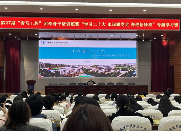 校党委委员、副院长郑承志以《坚定理想信念,争当社会主义现代化建设的合格生力军》为题,从学校两张名片的形成、同学们坚定理想信念的途径等方面展开,用大量生动的案例,尤其是学校标志性照片,带领同学们回顾百廿校史、展望美好未来,号召大家学习科学理论、练就高强本领;提升道德修养、夯实道德基础;依托文化自信、提供持久动力;理论联系实际,勇于艰苦奋斗,争做有知识、有文化、有技能的商贸学子。新思想引领新青年,新时代开启新征程,校党委委员、学生处处长兼团委书记郑伟作《学习党的二十大精神,绽放青春绚丽花》专题讲座,将党的二十大报告中关于青年的论述与我校青年学子实际结合,鼓励大家将个人理想融入学校、社会和国家之中,立志做有理想、敢担当、能吃苦、肯奋斗的新时代好青年。为进一步提高团学骨干的文字工作素养和信息化办公水平,信息与人工智能学院党总支书记郑晓明给学员作了《创意、布局、格调——高水平校园新闻稿写作之道》的讲座,从创新思维、精巧布局、格调品味三个方面,凝练写作技巧,拓宽了同学们的文学知识面,对于弘扬校园文化、推动团学宣传起到了积极作用。招生就业处处长孙握瑜作了《PPT在团学组织中的应用》专题讲座,从优秀团支部评选实际案例展开,围绕PPT的内涵、制作步骤、版式设计、设置动画及保存放映五个部分,帮助同学们掌握技巧,提升工作学习效率。团委副书记虞昌亮作《二十岁遇见二十大——遇见更好的自己》专题讲座,以我校优秀毕业生成长事迹勉励同学们自律才有自由,努力才会优秀,抓住二十岁的重要阶段,练就过硬本领。