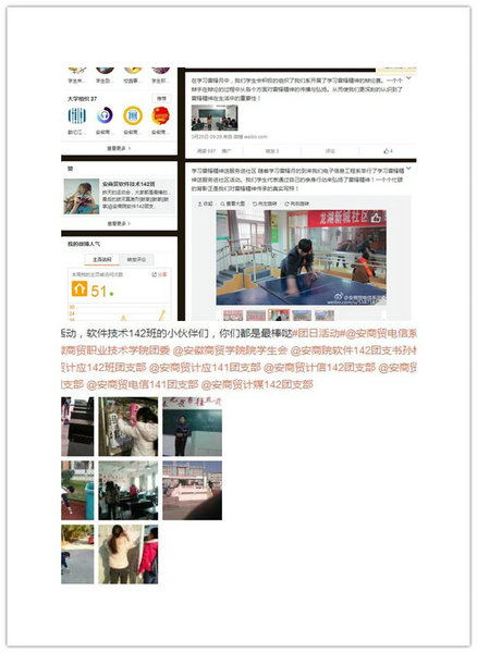 雷锋月系列活动开展过程中,各班级利用微博、QQ、微信等新媒体发布“弘扬雷锋精神,践行核心价值”主题文章,同学们积极评论与转载,在学生中掀起了帮扶他人、奉献爱心的热潮,推动了学习雷锋活动的常态化。