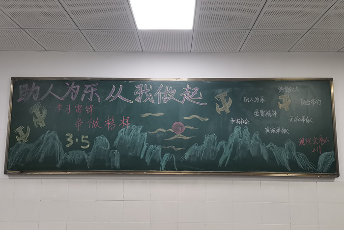 3月是学习雷锋活动月,虽然雷锋早已离我们远去,但雷锋那不随时空而逝的精神仍在不断激励一代又一代的人成长。为深入学习雷锋精神,提升同学们的人文修养,提高同学们思想觉悟。在辅导员的号召下,现代文秘211班开展了学雷锋精神主题板报活动。