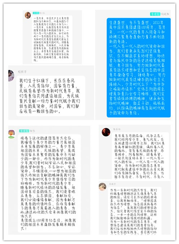 文秘202班王强强:作为一名共青团员,我要把自己的爱好需求与国家的发展相结合,全面规划自己的人生,对未来有美好的憧憬,并有脚踏实地的行动,积极关切国家和民族的发展,在学习和实践中走向未来。学生会主席焦光豪:作为一名学生干部,要始终牢记自己的职责,在搞好自己学习的前提下,努力提升服务能力,发挥好好桥梁纽带作用,带领同学们努力学习,积极奋斗,奋发图强。团总支学生兼职副书记胡菲靓:作为一名学生团干部,我要不断增强团结青年的责任感、使命感,引导青年不断提升自身的综合能力,用实际行动为国家和民族的复兴贡献力量。