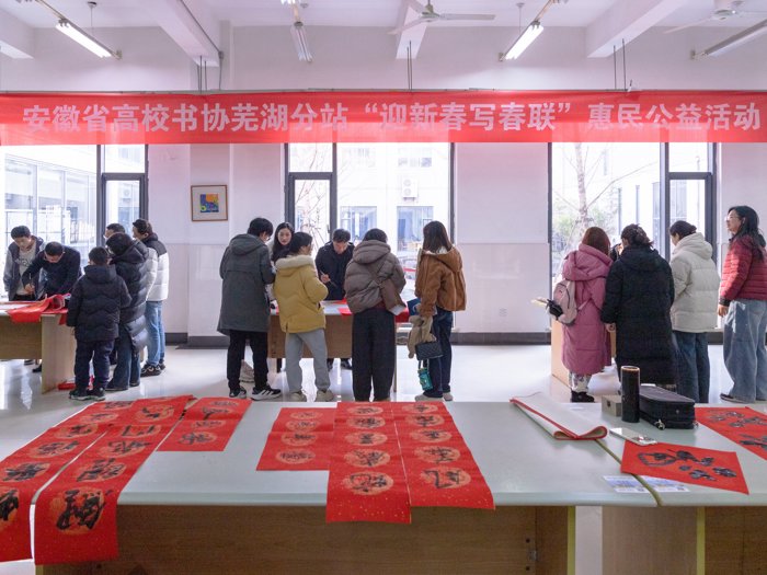 为弘扬传统文化,共庆新春佳节,元月8日下午,在安徽省高校书法家协会芜湖分站的大力支持下,校工会联合图书馆共同举办“墨香送福”迎新春写春联活动。庄华峰、姚金中、胡建平、司福明、朱吉玉、许美珏等书法家受邀挥墨,在图书馆一楼书库为全体教职工写春联及“福”字。党委委员、纪委书记黄继胜,党委委员、副院长汤飚现场走访观摩。