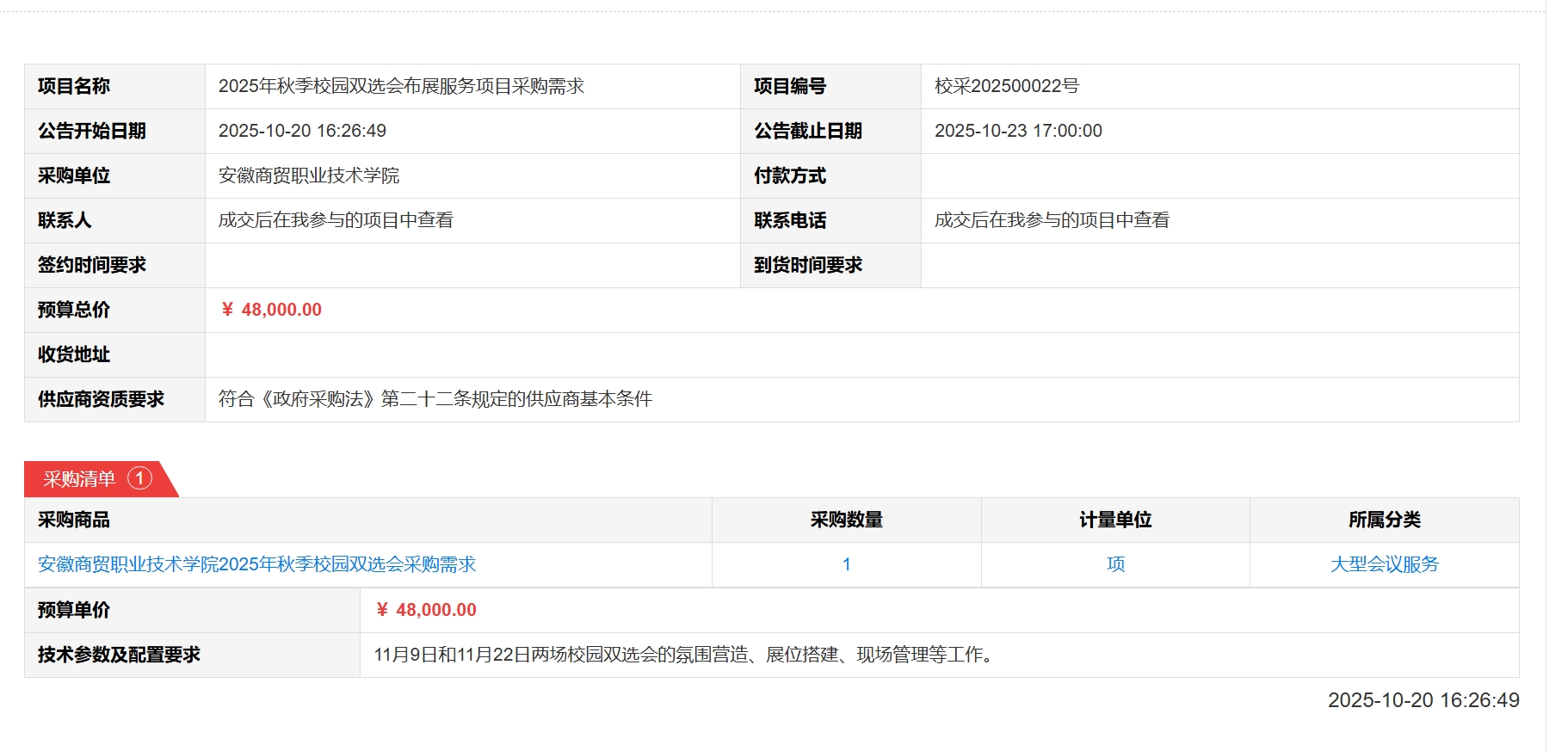 2025年秋季校园双选会布展服务项目采购需求(校采202500022号)采购公告