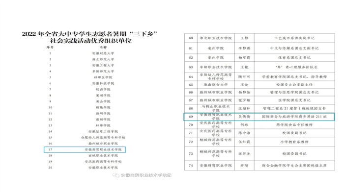 近日,2022年安徽省大中专学生志愿者暑期“三下乡”社会实践活动评选结果公布,我校暑期“三下乡”社会实践活动获团省委两项表彰,学校荣获优秀组织单位,学生吴倩倩荣获优秀个人称号。