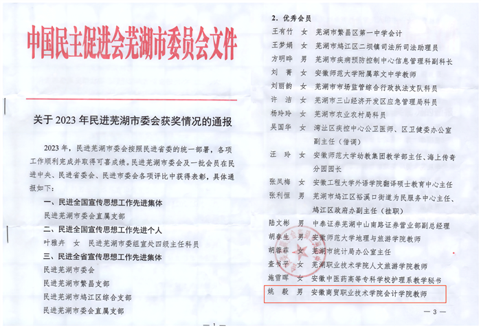 “2022-2023年度民进芜湖市优秀会员”荣誉称号。