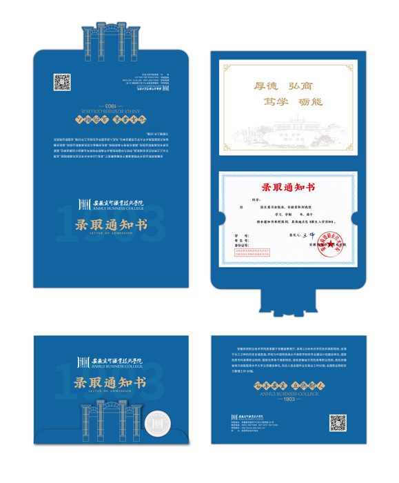 通知书采用独特折叠结构,展开时1903建校年份跃然眼前,象征着学校跨越百年的教育传承。特别选用拉丝银工艺制作校徽封口,既是对学校标识的尊崇呈现,又暗喻莘莘学子即将开启璀璨的大学生涯。